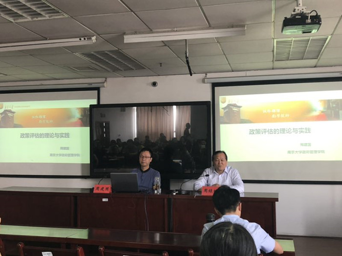 6月1日下午,南京大学政府开云电子体育_开云(中国)副院长、博士生导师周建国教授应邀,在三江楼1819报告厅做了题为《政策评估的理论与实践》的学术报告。开云电子体育_开云(中国)党委书记、公共管理学科带头人、博士生导师周绿林教授主持讲座。公共管理学科教师、研究生和MPA2017、MPA2018级学员等共同聆听了报告。